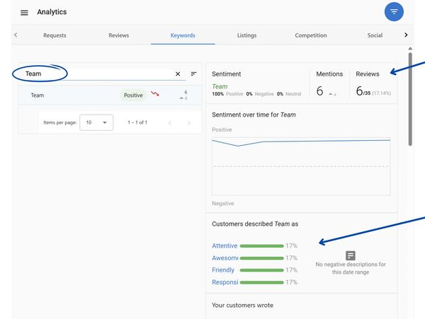 Scroll down to view how many reviews used that word, and reporting based on customer sentiment.
